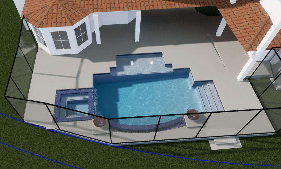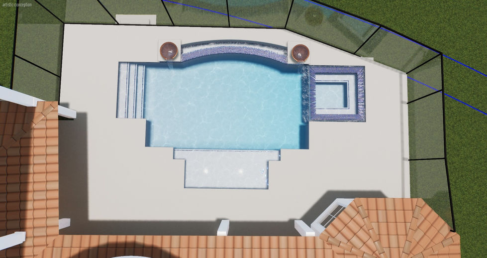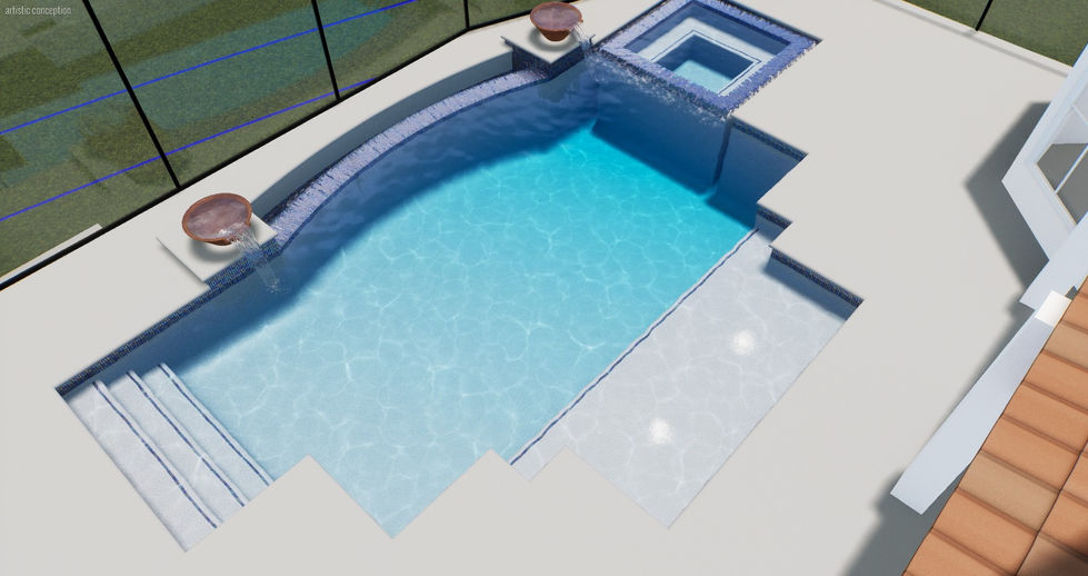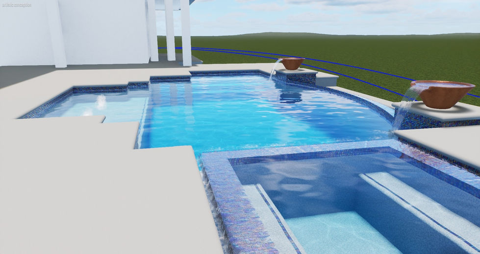 Rectangular Pool, Square Spa, Sun Shelf, Water Bowls on Pillars